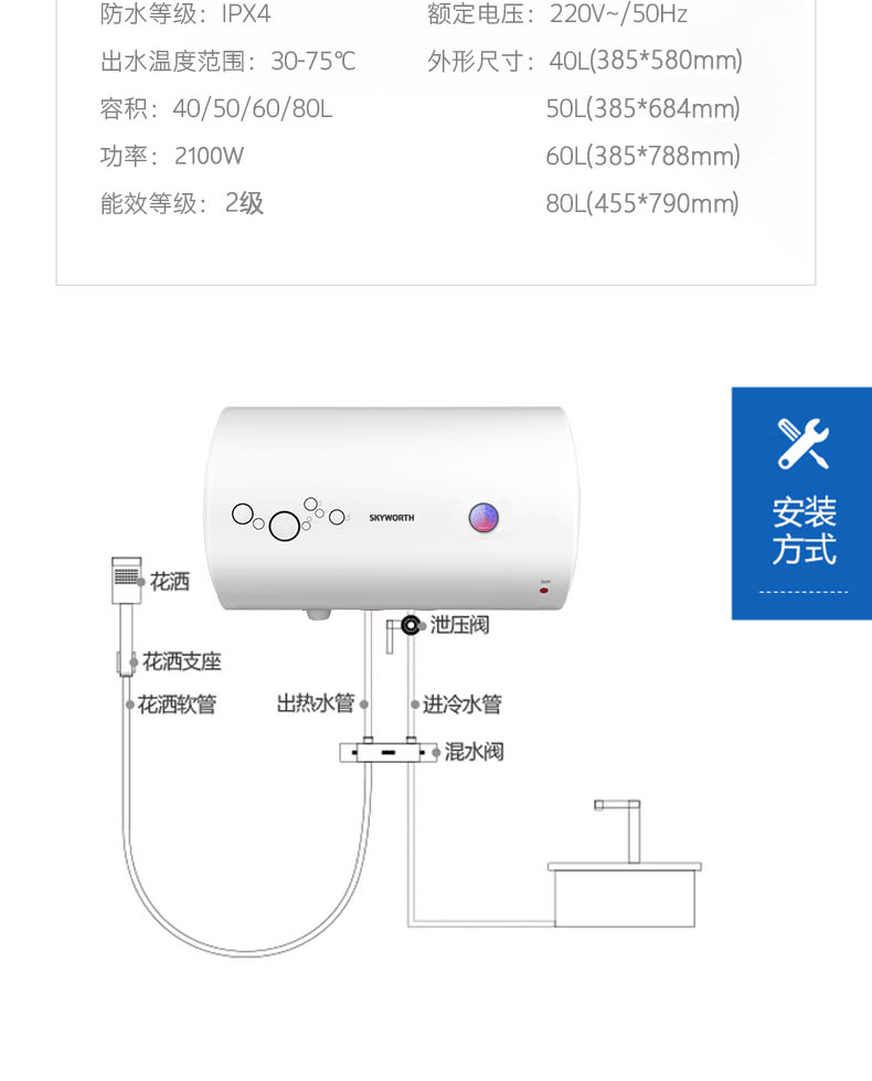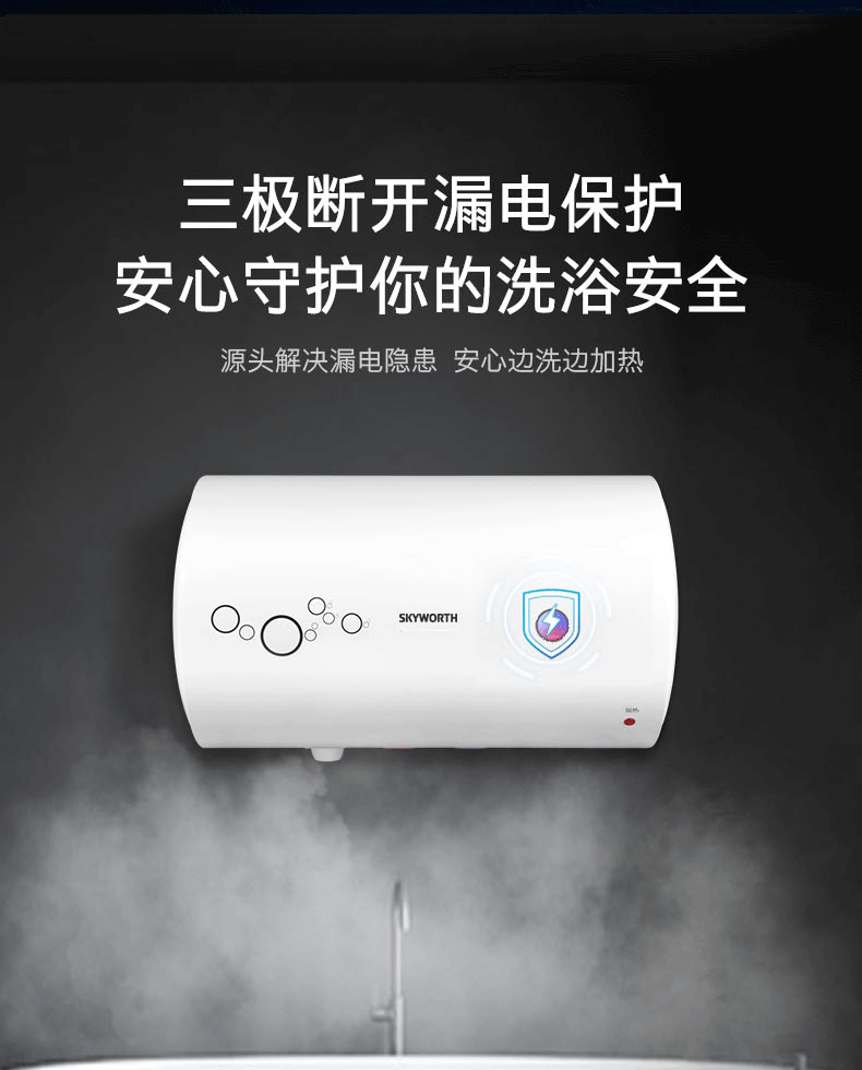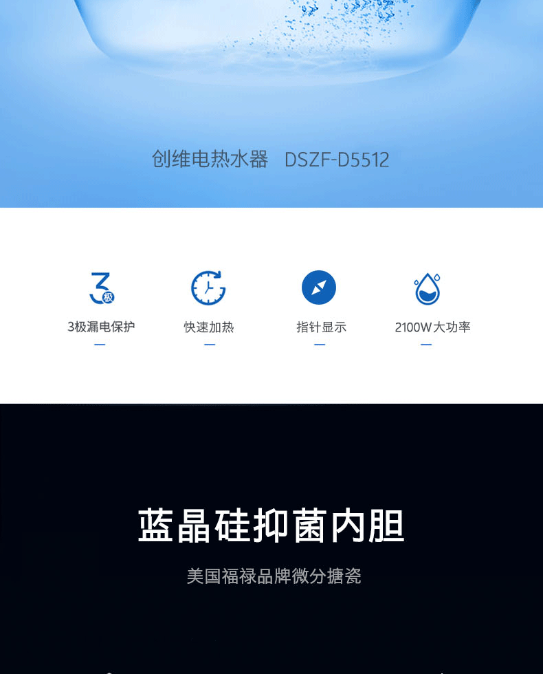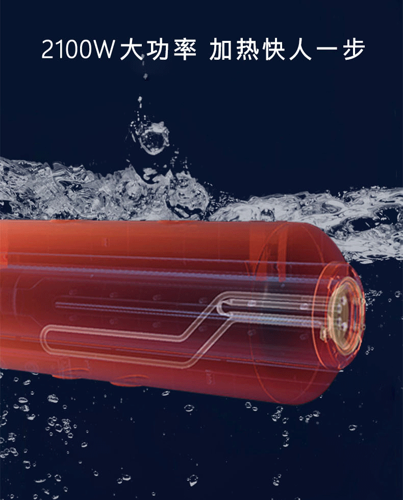 安全防電閘,全時(shí)護(hù)航家人用水安全; 2100W速熱,插電就洗熱水澡
