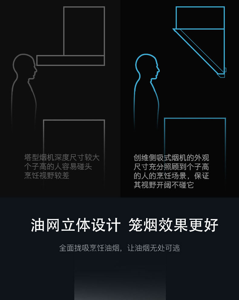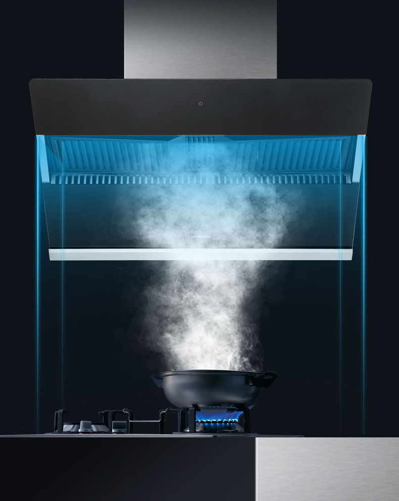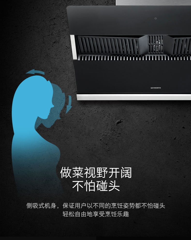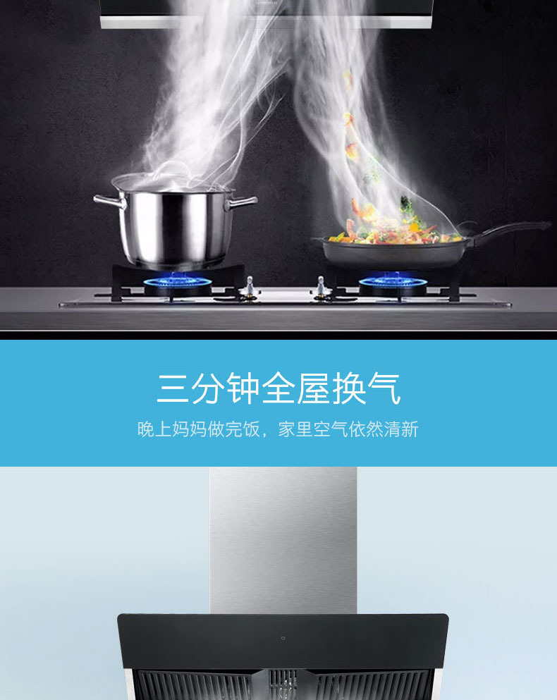 閃吸速排,油煙不上臉,烹飪美食更舒適;側(cè)吸不碰頭,炒菜無壓力